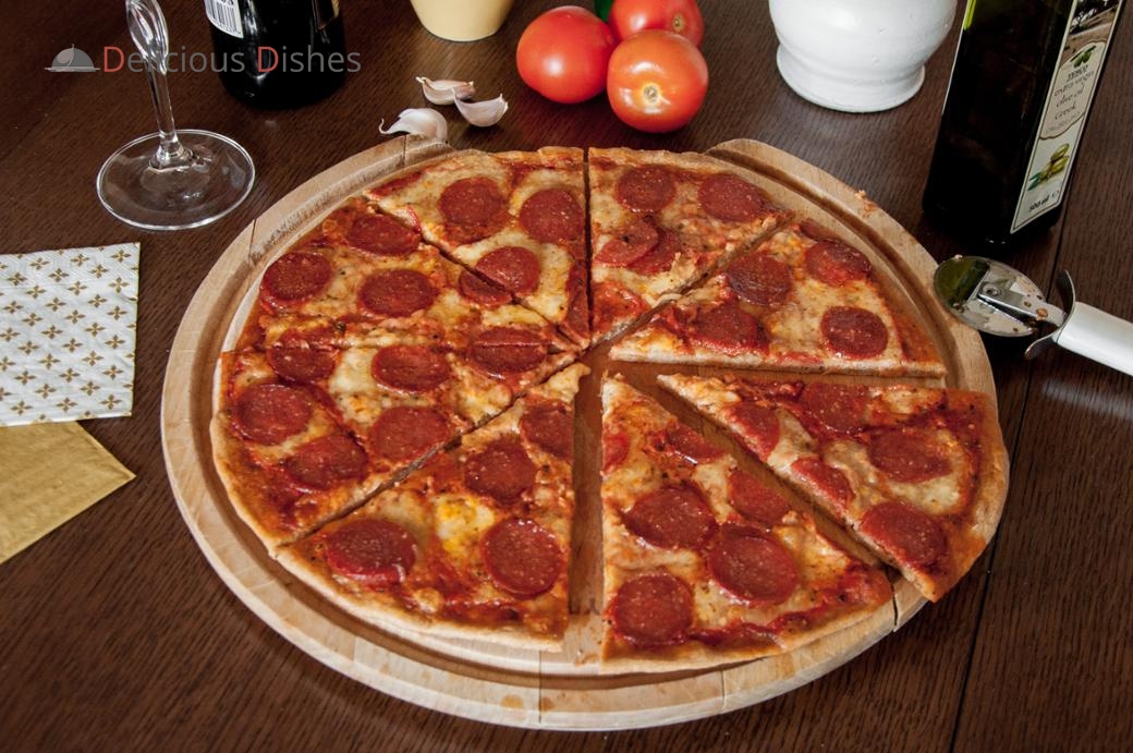 Пицца с моцареллой, томатным соусом и острой колбасой Пепперони.