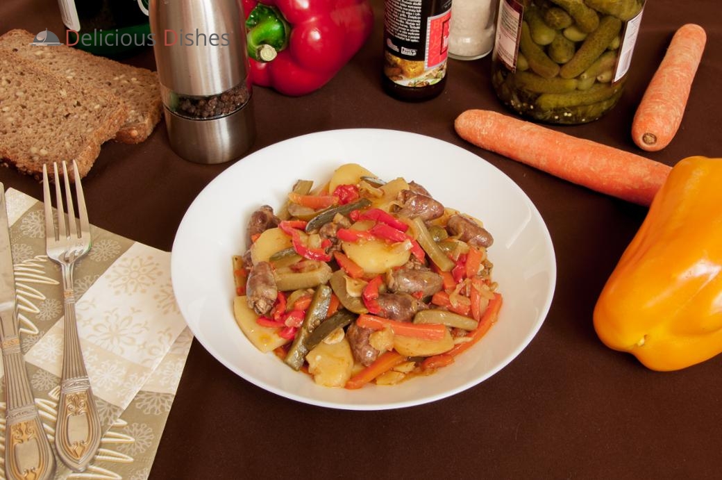 Куриные сердечки с тушенными в пиве овощами и соленными огурцами.